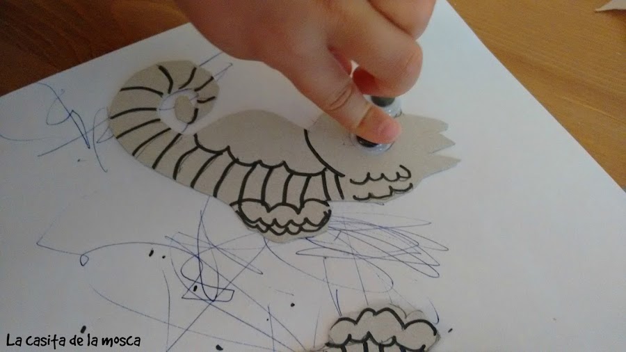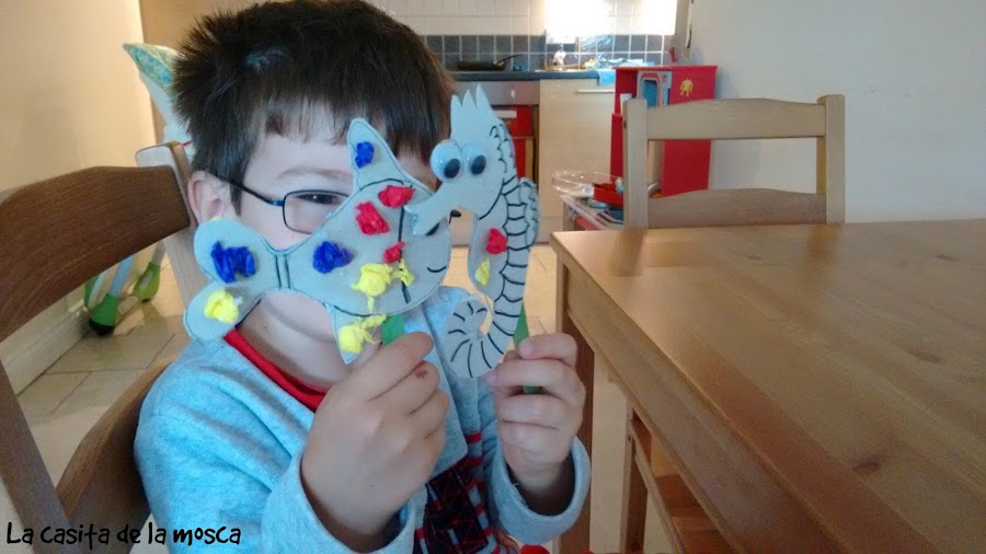 En primer lugar, debes dibujar en el cartón (yo uso el de las cajas de cereales) el dibujo de la marioneta que quieras hacer. Como viene el verano, elegí este caballito de mar y un pez, pero cualquier animalito o figuta vale. La decoración ya es cosa tuya y si no tienes ojos de estos tan chulos, pues se los pintas y listos!!