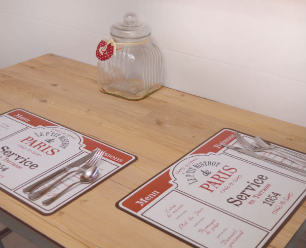 Sólo necesitáis media hora y unas lamas adhesivas de las que venden en tiendas de bricolaje para imitar suelos de madera. Os reguntaréis: "¿Lamas para suelos encima de la mesa?" Os prometo que son una absoluta maravilla. Nadie diría ahora mismo que mi mesa no es de madera (la imitación es alucinante) y además nunca he tenido una mesa más limpia. Las lamas son de vinilo, así que se limpian a las mil maravillas con cualquier producto de limpieza. ¿Queréis ver la transformación?