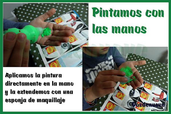 Dejamos que el niño se eche sobre la mano pintura y que la extienda con ayuda de un pincel o de una esponja. En este caso, hemos utilizado una esponja de maquillaje y pintura al agua que venden en la sección de niños de Ikea. Esta pintura viene en unos botes con dosificador y son geniales para cantidad de manualidades con niños porque las pueden aplicar directamente sin necesidad de pincel y, además, se limpian con mucha facilidad.