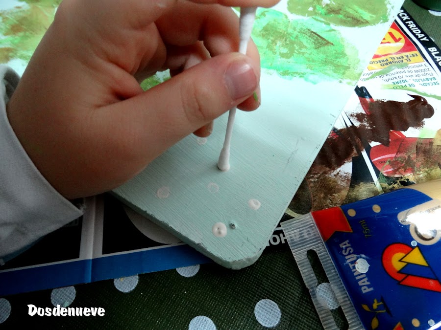 Para pintar los copos de nieve, hemos utilizado un bastoncillo en lugar de un pincel.