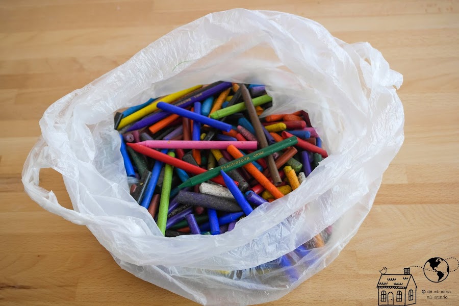 ¿Te animas a reciclar vuestras pinturitas ? Seguro que tienes un montón de trocitos por ahí guardados como yo, mira ¡qué bolsa de pinturas viejas!