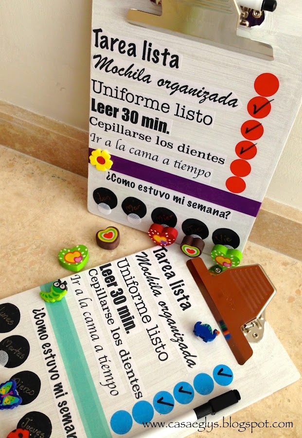 Para mi facilidad, imprimí las tareas o responsabilidades que quería que realizaran los niños como rutina diaria después del colegio. Pero si tienes bonita letra lo puedes escribir con marcador. Luego le pegamos círculos adhesivos que servirían para colocar la palomita o la equis a cada actividad.