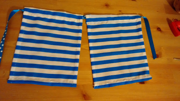 Luego cose las cortinas, debes dejar en la parte superior de éstas un dobladillo para poder pasar el cordón o lazo, te puedes ayudar con un imperdible.