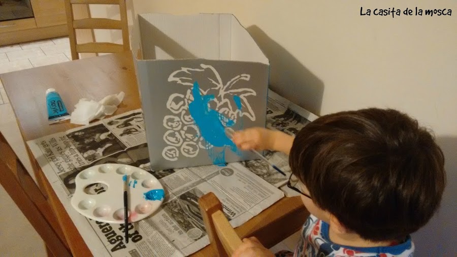 Para empezar tienes que hacer un agujero en la caja de cartón, con forma de cuadrado, bueno o redondo, eso va a tu gusto, a modo de escenario. Yo lo hice con un cutter. Luego pinta a caja a tu gusto, yo elegí el color azul que es uno de los favoritos de Blastonpower. Como podéis ver él me ayudo a pintar...
