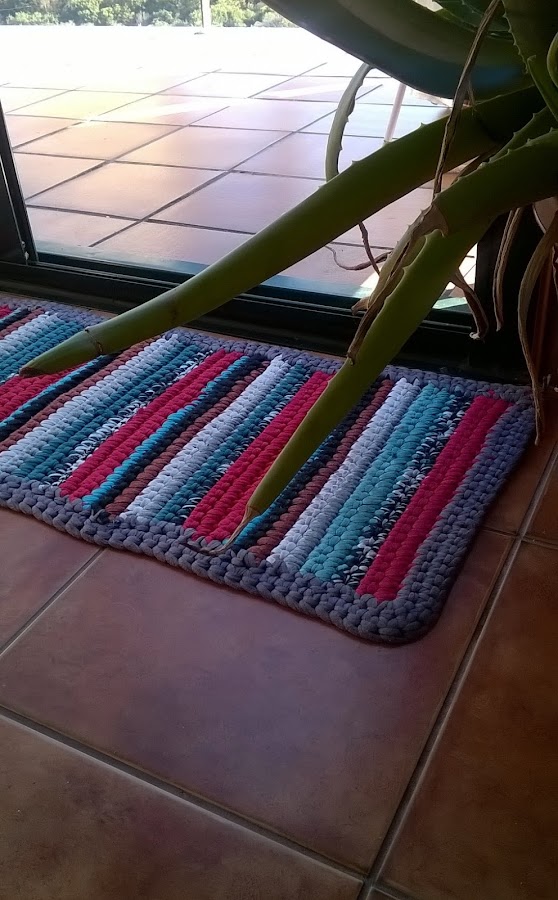 Lo que hice realmente no tiene ciencia (para las que saben tejer claro esta) fui tejiendo un rectángulo largo (la puerta es doble) a punto vareta y cada hilera de un color diferente, al terminar solo pase por los bordes de toda la alfombra dos hileras en un tono gris oscuro a punto bajo para rematar.