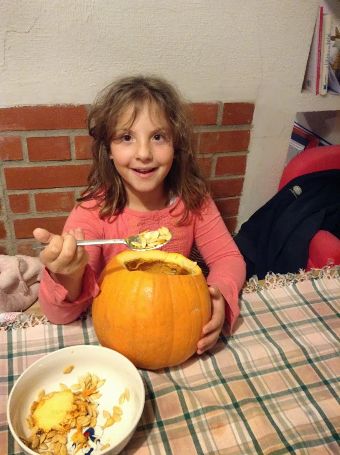 Ayer nos hemos dedicado a esta labor, a vaciar nuestra calabaza, jajajaja reconozco que la peor parte se la he dejado a mi hija que es la tediosa labor de vaciarla, pero ella disfruta mucho, así que... too pa ella!!!!