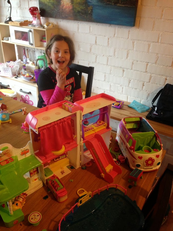 Sara hoy se levanto de lo mas ociosa y después de que se disgustara un poco porque se ha cancelado los planes de cumpleaños que teníamos hoy para pasar el día en un parque de tirolinas, ha optado por sacar sus pin y pon y ponerse a jugar. Adoro verla jugar con sus juguetes.