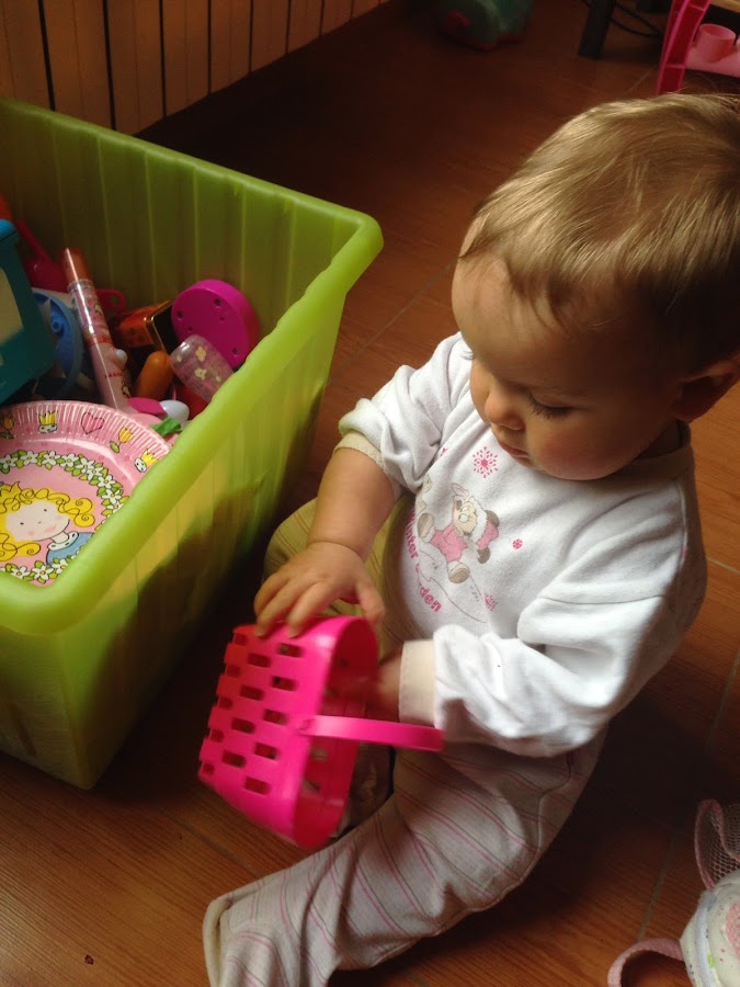Carlota esta en modo exploradora y se recorre la casa a gatas, siente curiosidad por todo y ahora esta liada con una caja de juguetes de Sara.