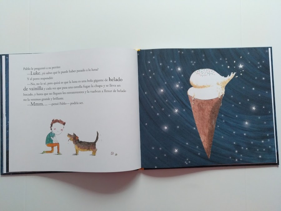 Como todos nosotros percibimos de forma diferente nuestro entorno, los amigos de Pablo también dan una percepción diferente de la desaparición de la luna. Así por ejemplo, el perro LUKE cree que la luna es una bola gigante de helado.