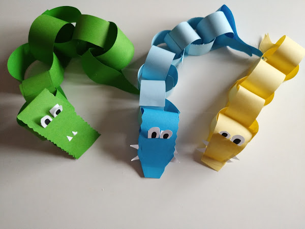 Los dragones se basan en una guirnalda de papel. Para hacerlas hemos recortado tiras de las diferentes colores y las hemos ido pegando en forma de círculo para que se sujeten entre sí.