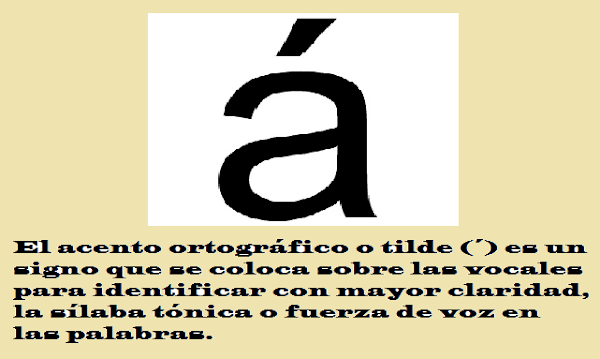 Así pues, el acento ortográfico o tilde (´), es una pequeña línea oblicua, que baja de derecha a izquierda del que lee o escribe (á, é, í, ó, ú). El acento ortográfico se coloca en casos determinados por ciertas reglas sobre la vocal de la sílaba tónica de las palabras.
