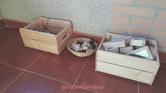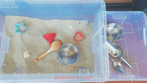 Pero al final, nos hemos apañados con dos cajones de plástico que teníamos por casa. Uno para contener la arena y el otro para los materiales de juego. El tiempo dirá si lo cambiamos.
