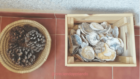 Si algo no puede faltar en un ambiente exterior, son las piezas sueltas, imprescindibles para el juego libre, y los elementos de la naturaleza. En nuestro casos, hemos incluido algunos materiales que vamos rotando en función de los intereses. Hemos dispuesto cajitas y cestos con nins, cubiletes,maderas, conchas, caracolas, piñas… En este espacio,me gustaría poder incluir alguna estantería, para aprovechar la verticalidad y colocar más materiales y piezas para el juego libre.