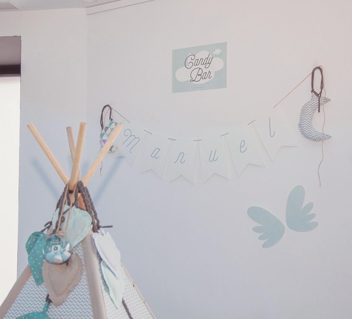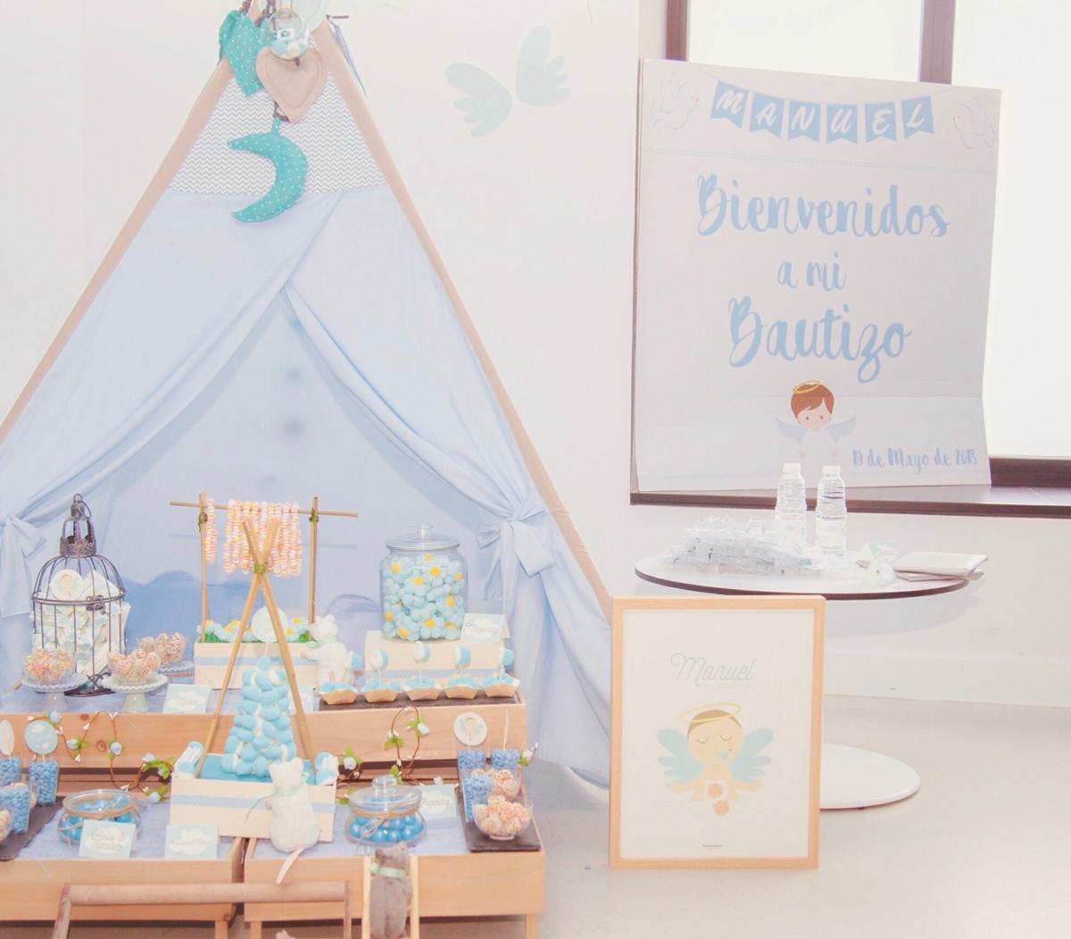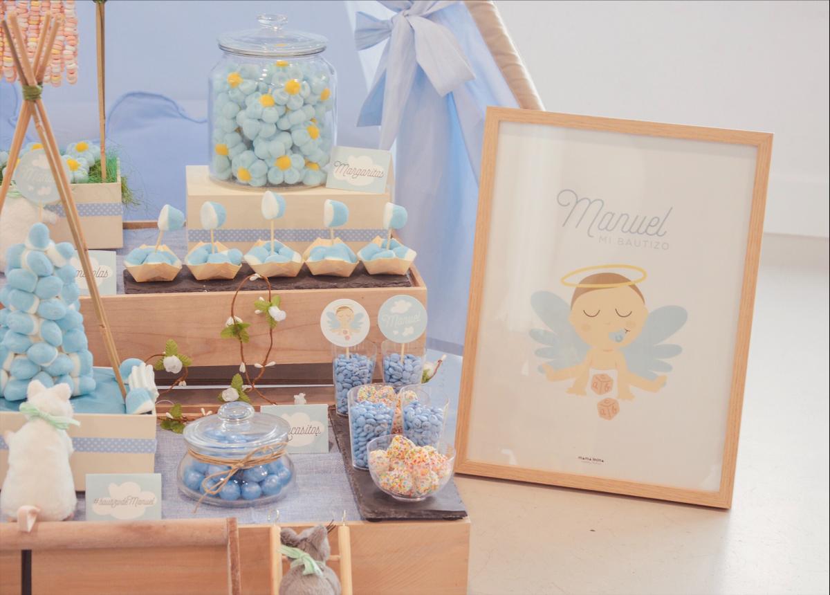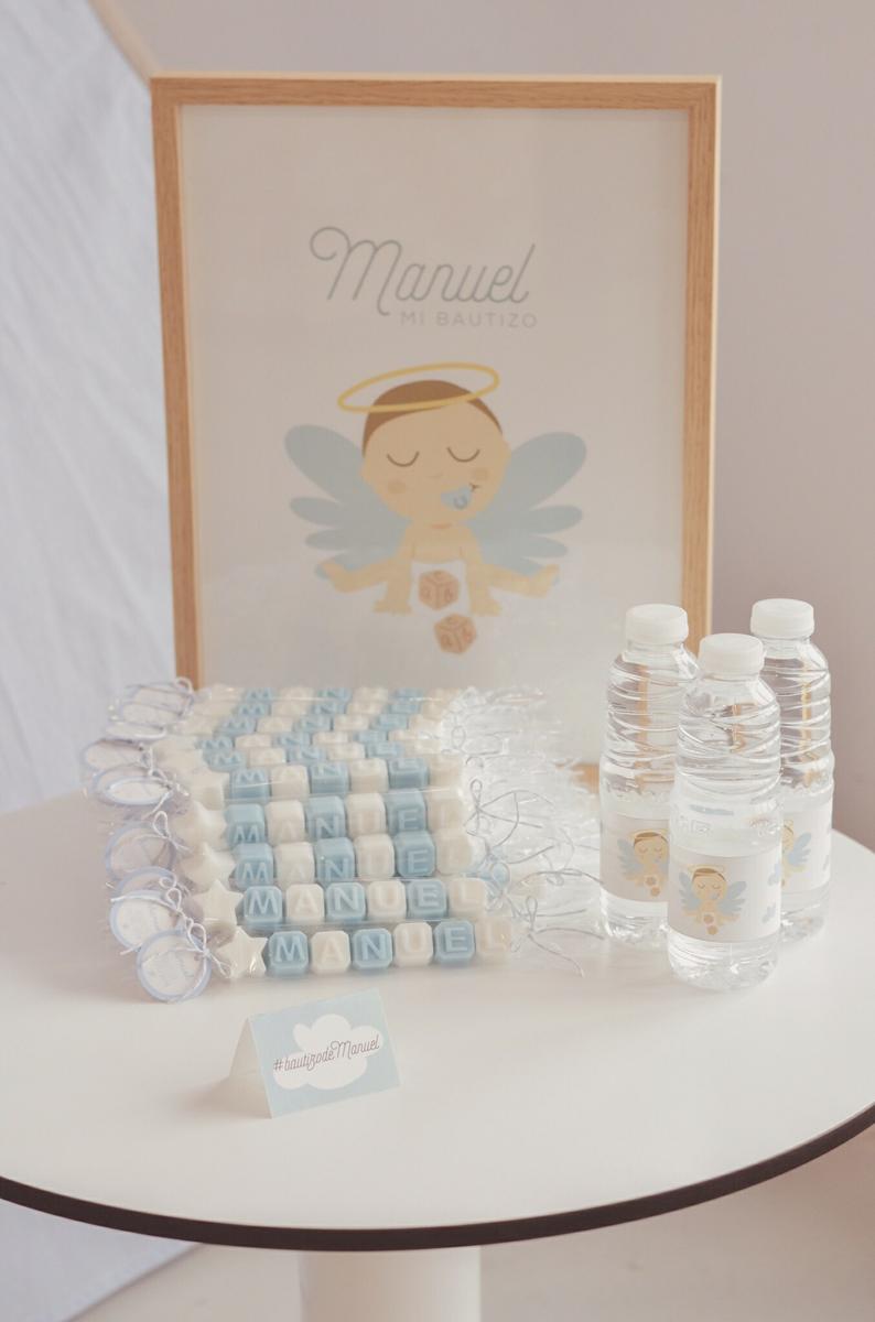 El kit de fiesta, es de MAMÁ LEONA, le dije que quería un angelito, le conté lo colores, le enseñe unas alas que me tenían enamorada. Ella agito su coctelera con todo la información y me sorprendió, el diseño superaba de lejos mis expectativas. Creo que no hay un diseño mas bonito para un bautizo, y no es porque yo haya colaborado en el