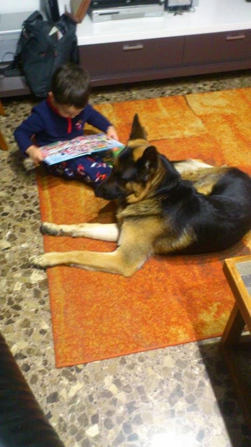 El Comando Piojo en la hora del cuento. Llamo al piojo, una, dos..tres veces. Nada. No responde. Salgo en su busca y escucho una algarabía en el salón. El piojo mosqueado con Gabo y Gabo empujándolo con el hocico. Juro que flipé en colores, ¡Lo empujó por el salón y el pasillo hasta dejarlo a mi lado! La semana pasada pensé que eso había sido una pura anécdota pero no. Tres veces se ha repetido la historia. Tres veces que el piojo no ha acudido a mi llamada.
