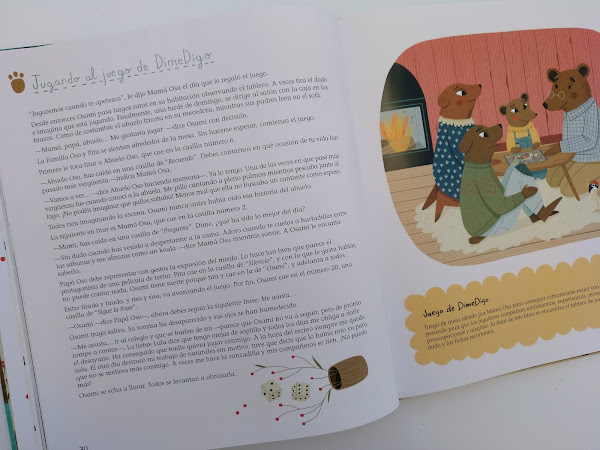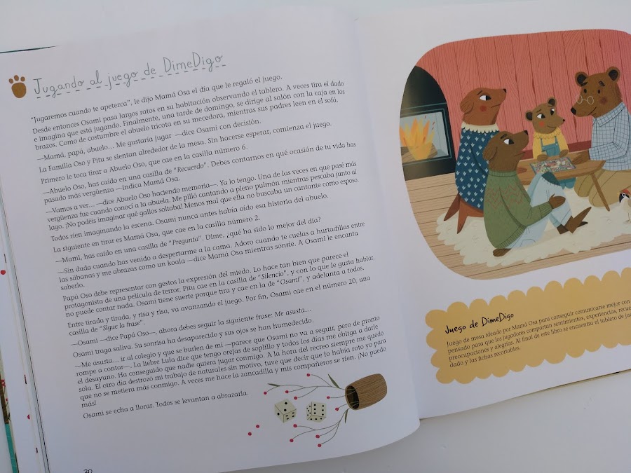 Como habéis podido comprobar, el libro se divide en 4 partes: las historias de la familia Oso, estrategias para expresarse y escuchar, un apartado para padres con ideas y observaciones para mejorar la comunicación con los más peques (como la escucha activa o la comunicación asertiva) y, finalmente, el juego de mesa.