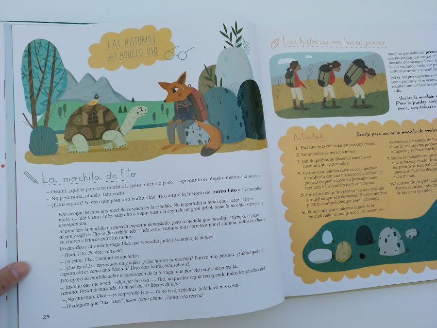 Es completísimo porque además de las historias acompañadas de unas ilustraciones preciosas, incluye actividades, reflexiones, metáforas, trucos, guía para adultos y un juego de mesa chulísimo.