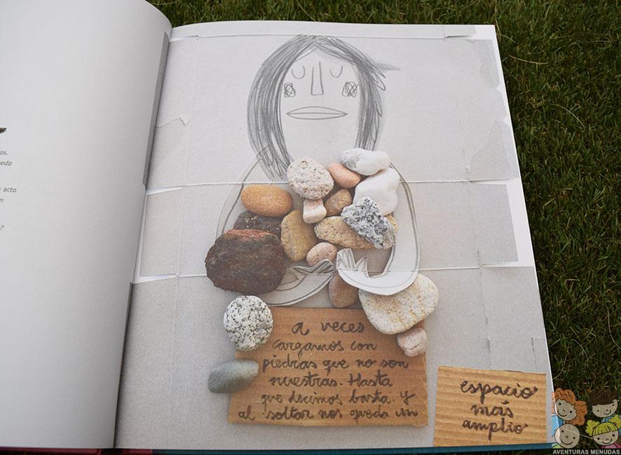 Y por otro lado, la emoción de Culpa le transmitió una necesidad imperiosa de quitarle a la chica todas las piedras que tenía encima. Me decía, “mamá, podemos quitárselas, que seguro que le pesan mucho”. Además, esta imagen transmite una sensación de realismo increíble, por los tonos, sombras y colores, que hacen que parezca de verdad.
