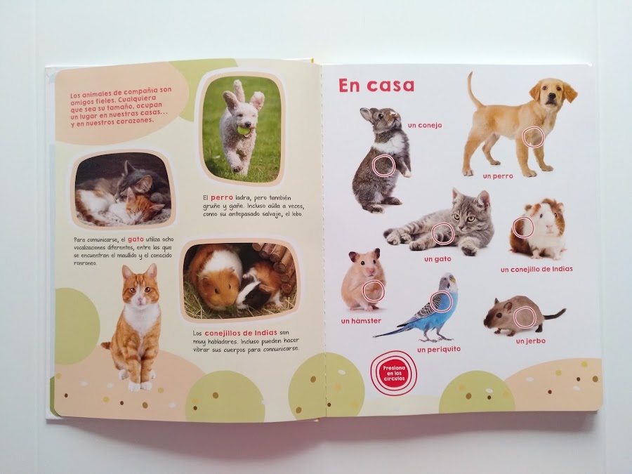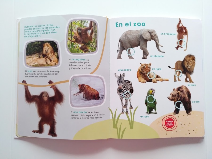 Es un libro con un formato diferente, dividido en siete hábitats distintos: la granja, en casa, en el bosque, en las zonas húmedas, en el zoo, cerca del mar y en el aire.