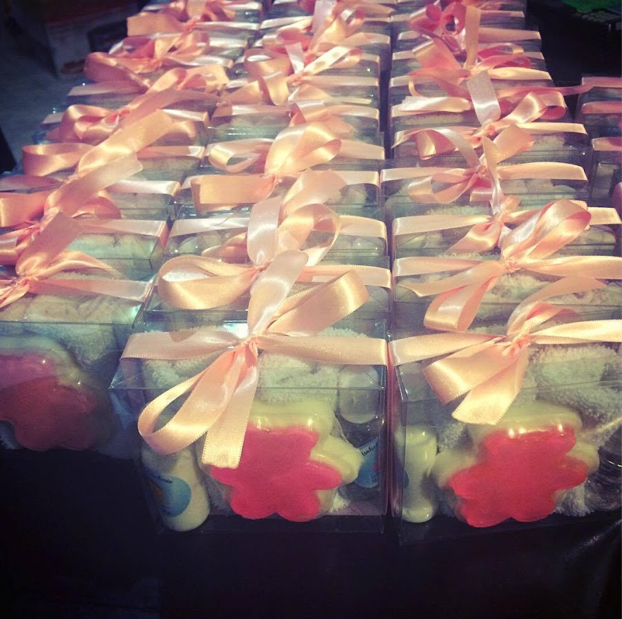 Los recuerdos los hicimos en casa, y elegimos jabones de glicerina, crema humectante y gel desinfectante para manos. Los pusimos en una caja de acetato acompañados de una toallita facial.