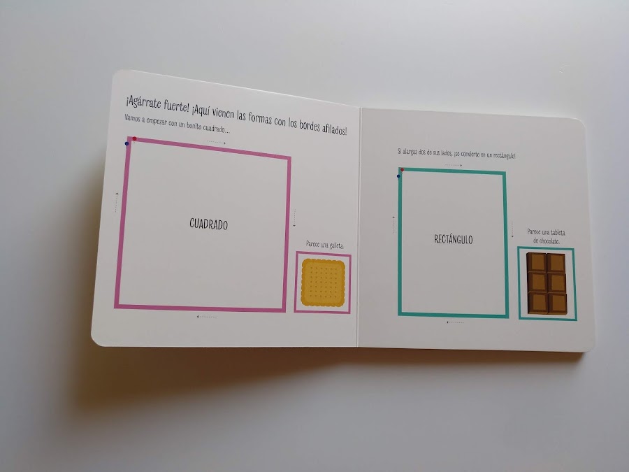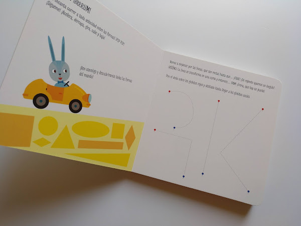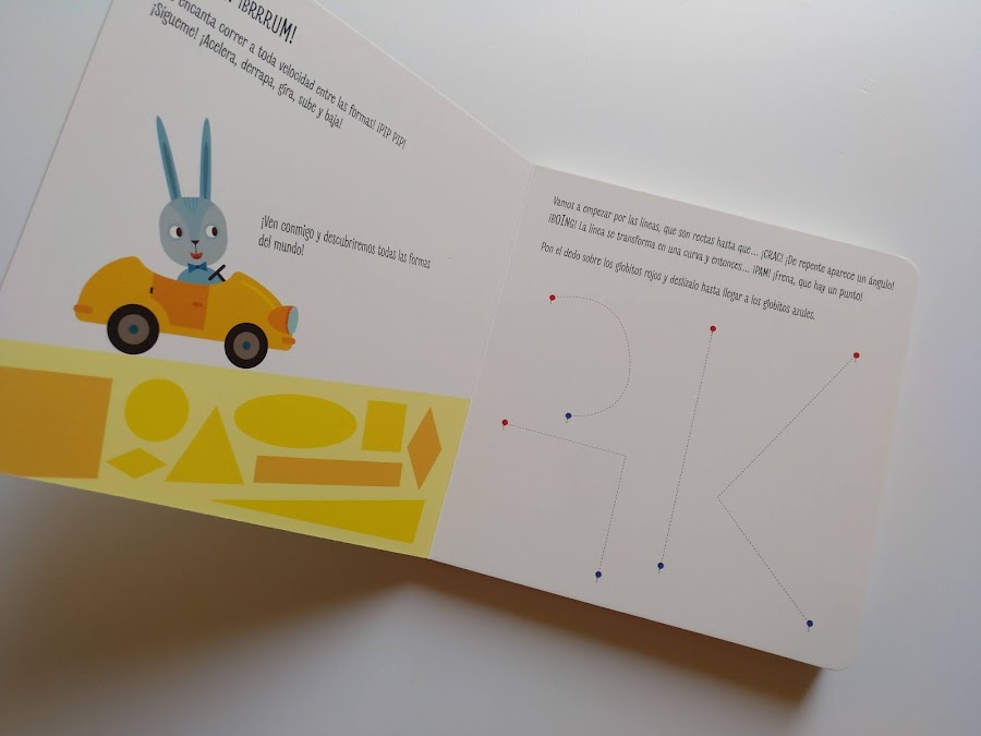 Además de las formas geométricas, este pequeño libro tiene como protagonista un conejito que invita a los peques a descubrir todas las formas del mundo conduciendo su coche amarillo por todas ellas. Empieza por las líneas rectas y las curvas, invitando a los peques a poner su dedito sobre los globitos rojos y deslizarlo hasta los globitos azules en todas sus páginas, recorriendo juntos las diferentes formas. Además, asocia cada forma geométrica a un elemento cotidiano. Por ejemplo, para el círculo un botón, para el óvalo un huevo, o para rectángulo una tableta de chocolate.