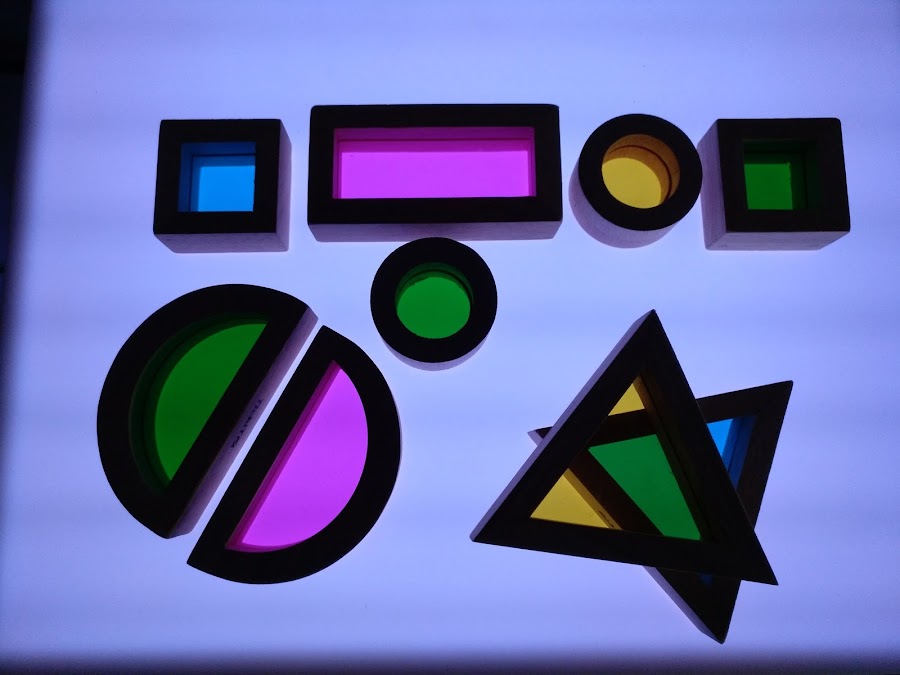Reconocer en los bloques traslúcidos para la mesa de luz (MUMUCHU), las formas geométricas que se han trabajado con el libro.