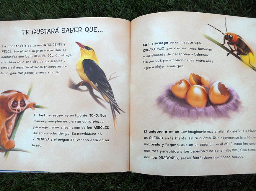 Al final del cuento, el niño puede seguir aprendiendo e investigando, ya que se detalla información de personajes y seres que participan en la historia. Por ejemplo, se explica con detalle qué es un Lori Perezoso, una Oropéndola, una Luciérnaga y un Unicornio. Es muy bonito leerles estas explicaciones después de la historia, ya que les permite adquirir vocabulario y seguir aprendiendo.