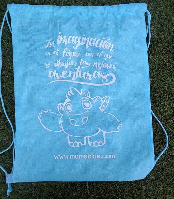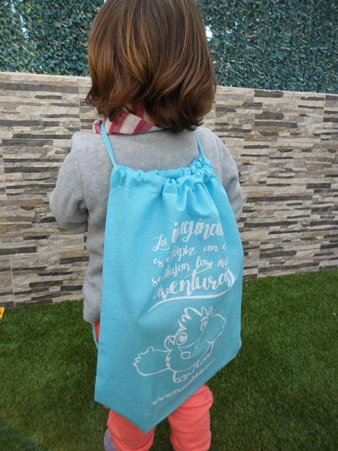 No puedo decir que haya algo que no me haya gustado. Nos ha encantado todo, todo, todo, ¡hasta la mochila que nos han enviado!. Mirad que bonita mi peque con su mochila de MUMABLUE. “La llevo yo, la llevo…”.