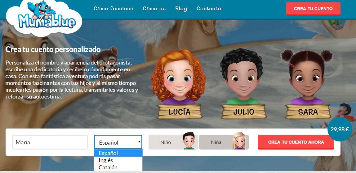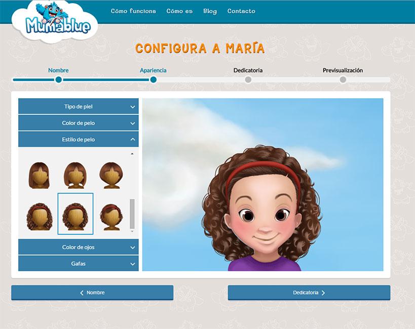 Crear el cuento es súper sencillo. Solo tenéis que entrar en su web www.mumablue.com y en su página de inicio ya podéis empezar a configurar el cuento. La peculiaridad de este cuento personalizado, es que no se “personaliza” con una foto del niño. La idea va más allá. La base es integrar completamente al niño en el cuento y que se sienta dentro y viva la historia que cuenta de primera mano. Por ello, el niño se incorpora en el Reino de Miriñán a través de un avatar, completamente configurable y adaptable al aspecto del niño o niña.