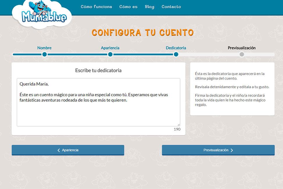 Después pasáis a crear vuestra propia dedicatoria, que irá al final del cuento. Y por último ya podéis previsualizar cómo quedará vuestro cuento. Es emocionante ver el avatar que habéis creado integrado perfectamente en toda la historia.