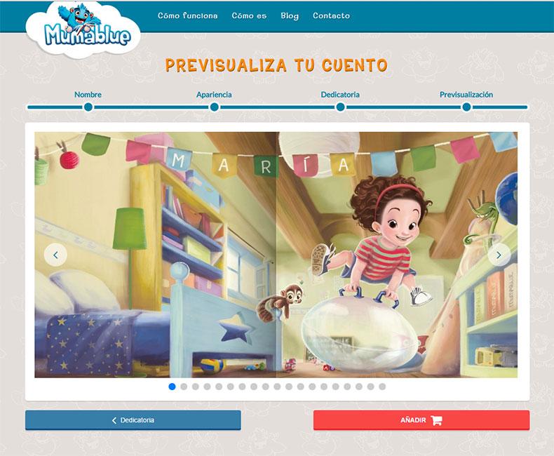 A nosotros nos ha encantado nuestro cuento. Me pidén leerlo todas las noches (y a veces en el camino con el coche a algún sitio también!!!! El cuento se viene de excursión con nosotros, jejejeje). Os recomiendo que entréis en su página www.mumablue.com y conozcáis de primera mano este cuento tan chulo, ya que podéis configurarlo y previsualizarlo para ver si os gusta.