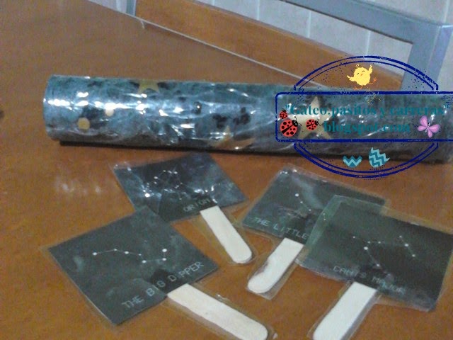 También se me ha ocurrido lo de plastificar y poner algo para que sujeten las tarjetas de las constelaciones,como los stiks de polo, ya que al ser tan pequeños al ponerlas en el extremo del tubo taparán la imagen y no la verán con claridad. Si no tenéis plastificadora se puede hacer con forro adhesivo.