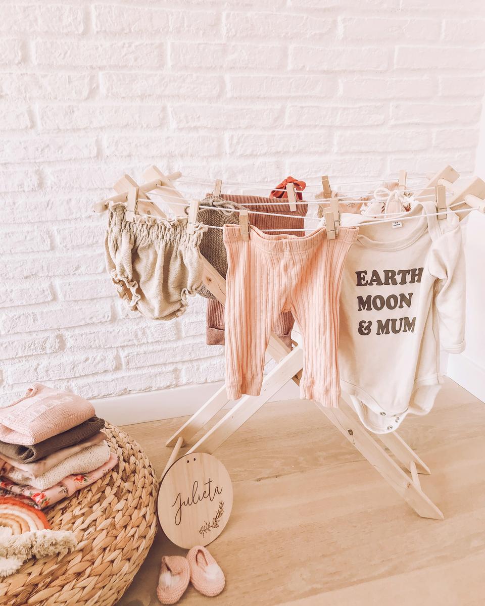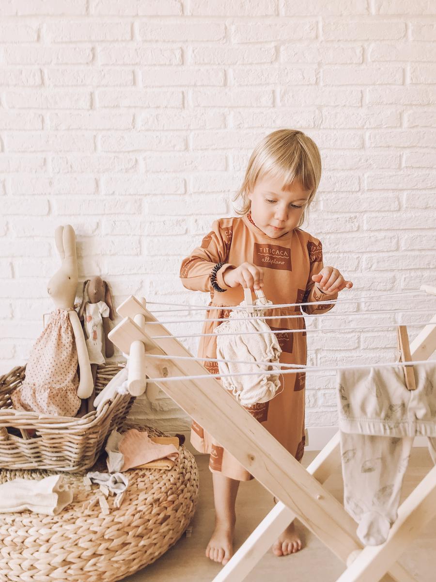 En nuestra casa (en una versión mucho menos Pinterest, por supuesto) la situación de tender la ropa es algo que se vive a menudo. No me quiero llegar a imaginar las lavadoras que voy a empezar a hacer en unas semanas… Así que la incorporación de un tendedero a su altura fue un acierto brutal. Al principio se frustraba mucho cuando no conseguía abrir las pinzas o colgar las prendas, pero ha sido en cuestión de días que le ha cogido el “truco” y ahora hay veces que hasta me pide que saque la ropa de los cajones para poder ella colgarlos.