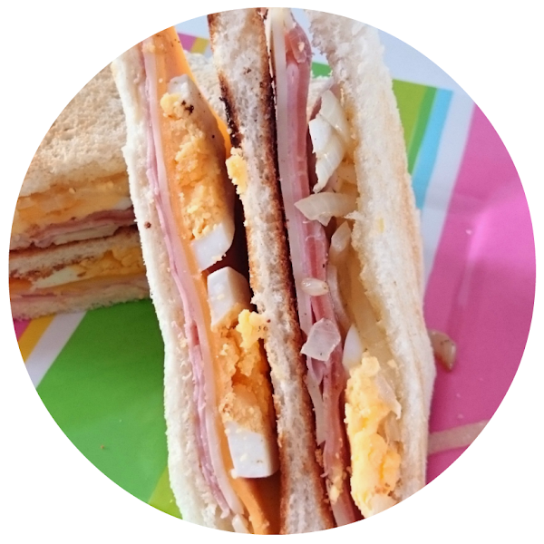 4º. Montar el sándwich: base de pan con mantequilla, queso emmental, cheddar, huevo duro, rebanada de pan, cebolla jamón serrano, pavo/jamón serrano y la tapa.