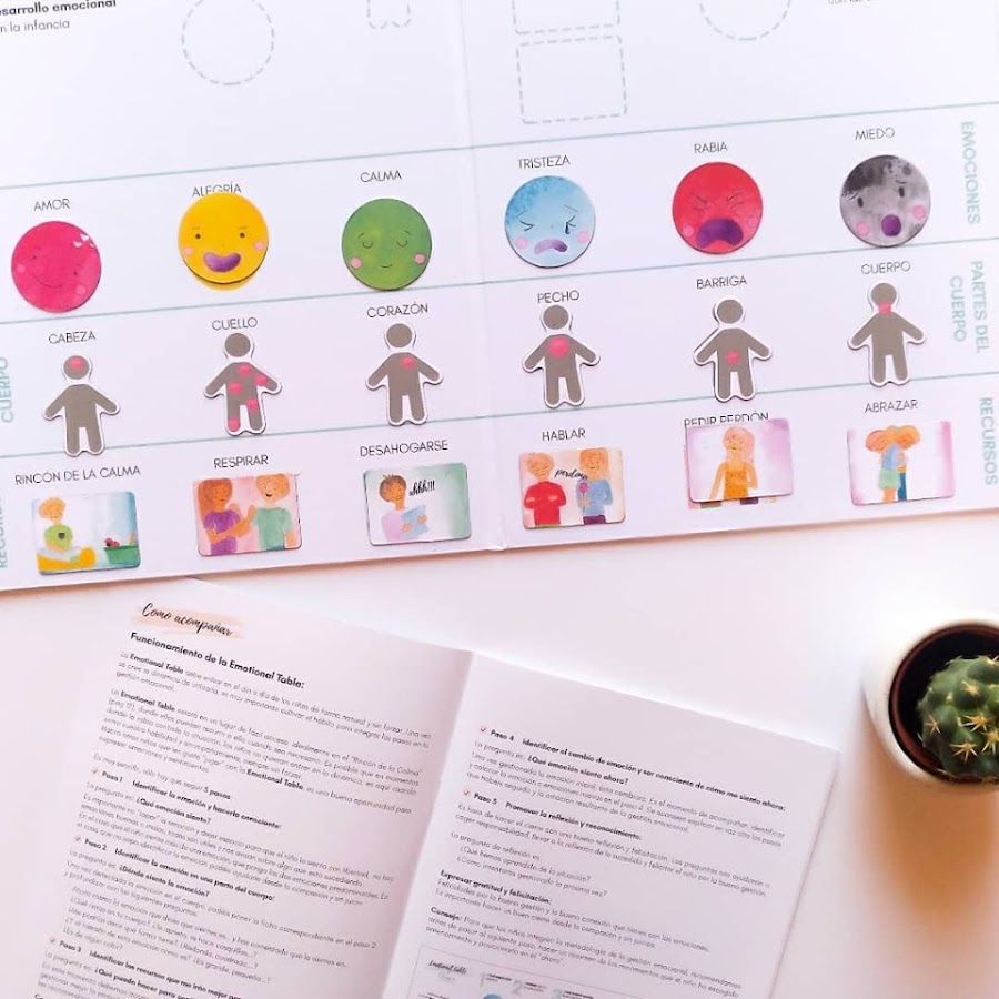 Además, su uso es súper sencillo. A mí me viene genial para los peques con los que estoy trabajando en el cole. Solo hay que seguir las preguntas que la tabla nos va haciendo. Además incorpora una guía práctica es la que encontramos diferentes pautas que nos ayudan a acompañar a los peques en esta gestión emocional y que por otro lado, recoge una serie de actividades para trabajar el desarrollo emocional con ellos.