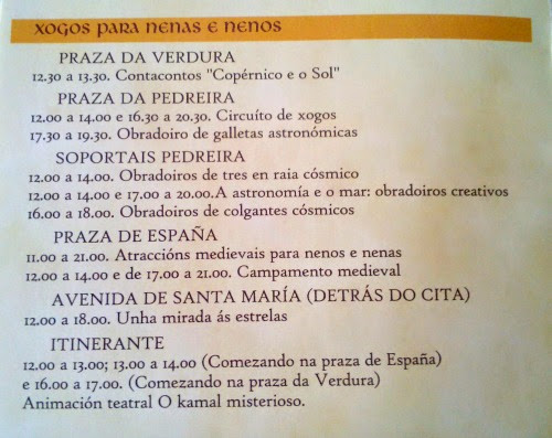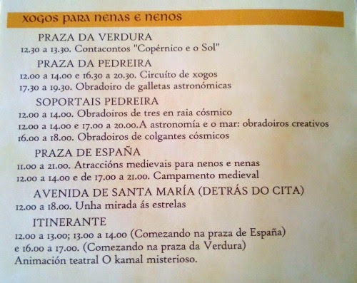 Por cierto, que me olvidaba. Cada año tiene una temática distinta, y la de este año el tema es la Astronomía, por eso verás alguna actividad dirigida a ello. Así que vamos a pedir a todos los astros que por favor no llueva, que la cosa pinta un poco mal... Además así podremos asistir a todas las actividades, y os las puedo ir enseñando.