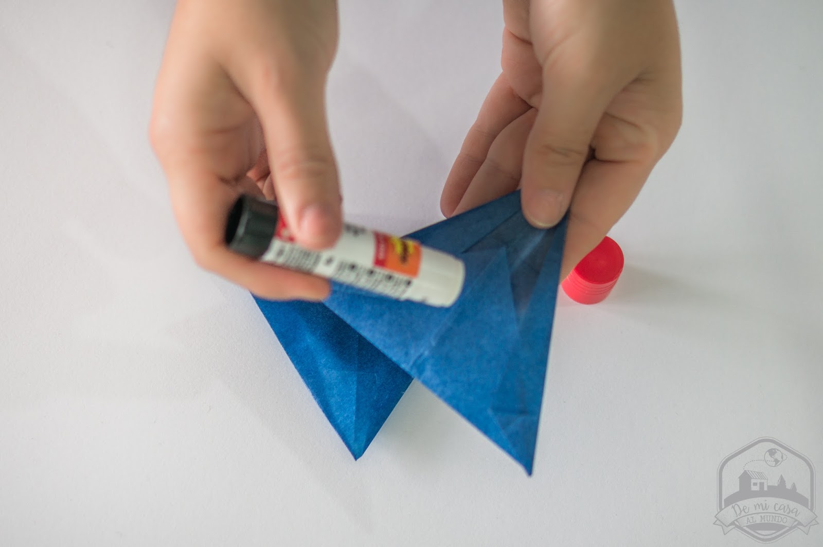 Después colocamos un triángulo hacia arriba y el otro hacia abajo y los pegamos con un poco de pegamento de barra y ¡voilà!