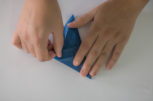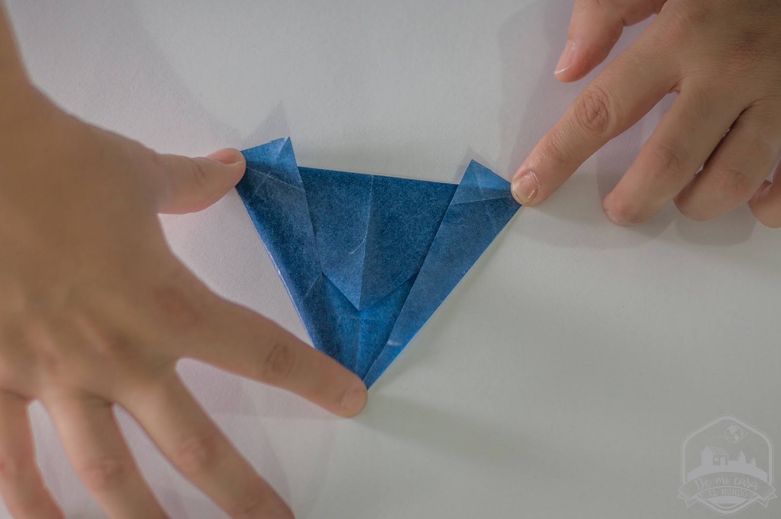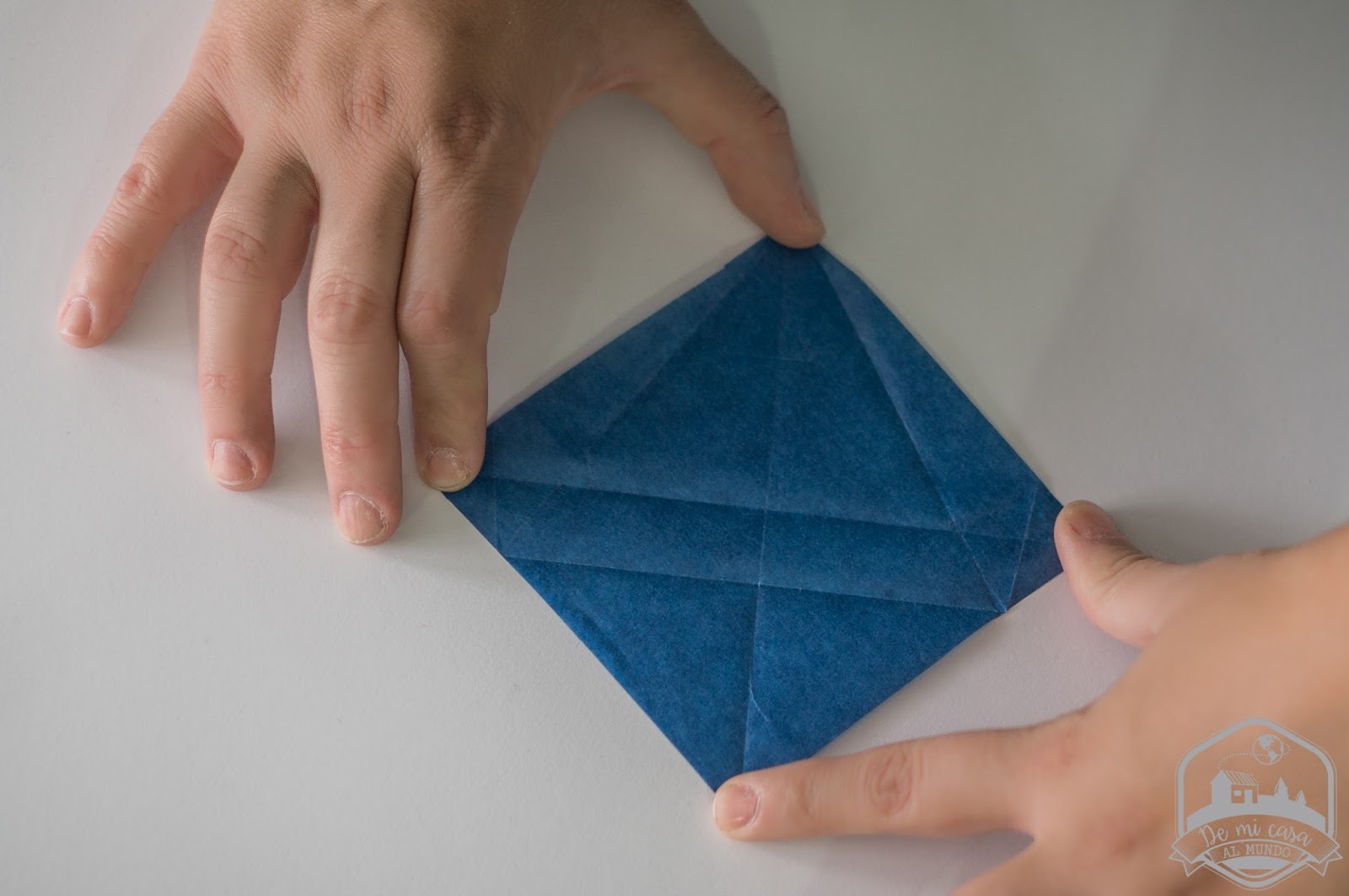 Comenzamos doblando la primera hoja en diagonal, de esquina a esquina. Abrimos el cuadrado y doblamos en diagonal hacia otro lado, de esquina a esquina. El papel ahora tiene pliegues que forman una X.