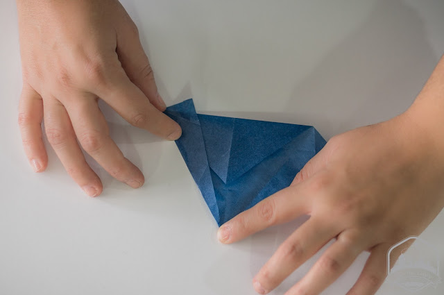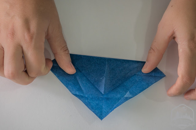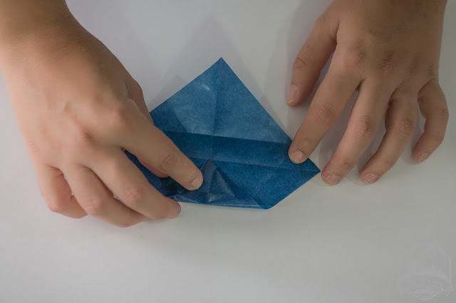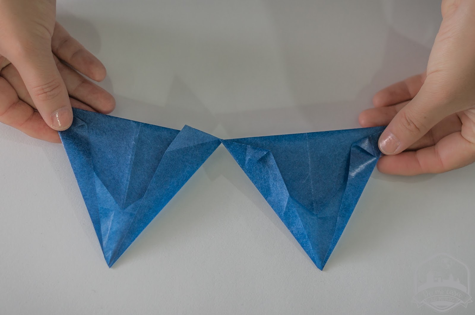 Cada estrella se configura con dos cuadrados que debemos plegar de la siguiente manera (perdona que se me olvidó hacer las fotos de proceso y las he hecho a posteriori por eso el papel ya tiene las marcas de las dobleces):