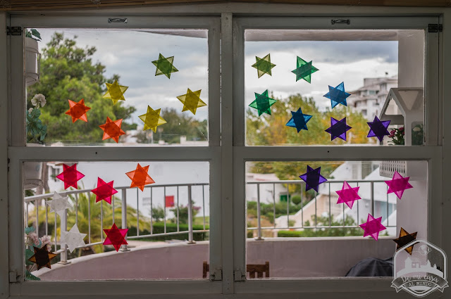 Ahora cada día del adviento colocaremos una estrella en la ventana, nosotros las hemos hecho siguiendo la gradación de los colores del arcoíris y este sería el resultado (hizo la foto F en nuestra casita de la playa para que Sunflower no viera cómo quedaba, pues es algo que irá descubriendo a medida que transcurra el adviento).