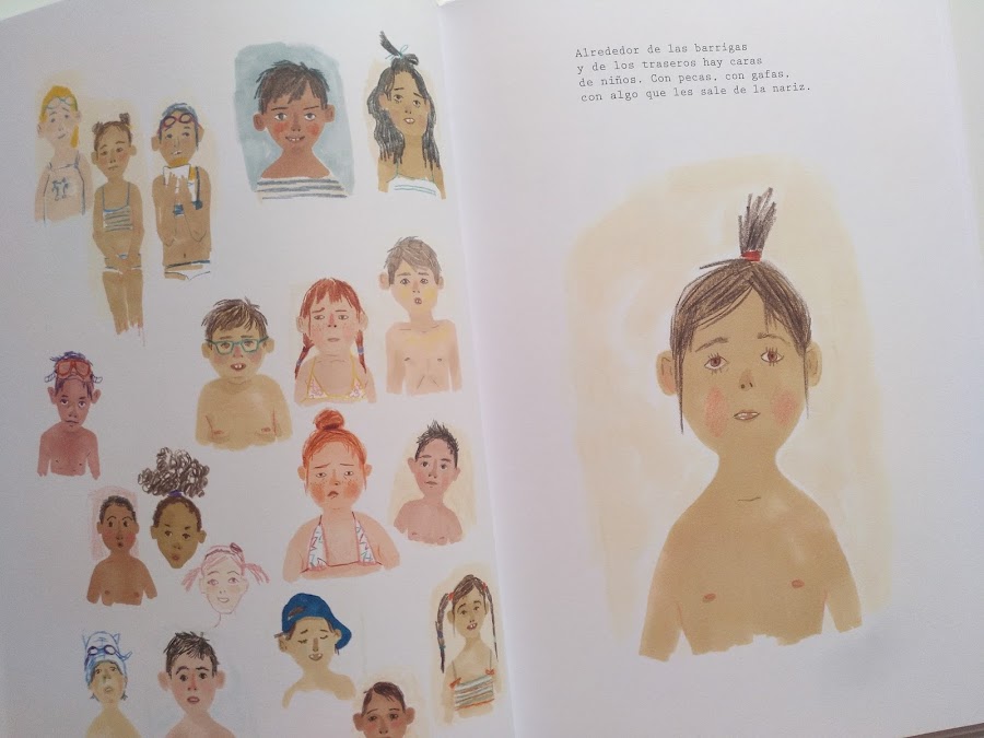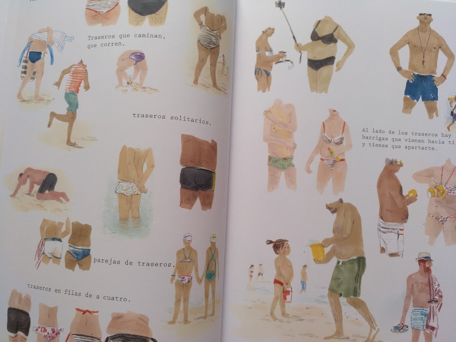 Durante el cuento, la protagonista explica todo lo que le ocurre con mucha ternura, gracia y naturalidad, como encontrarse muchos pies mientras busca caracolas, muchos traseros emparejados o solitarios cuando levanta la cabeza del suelo, muchas barrigas y muchos niños, muy diferentes, con gafas y sin ellas, con pecas y sin ellas,...