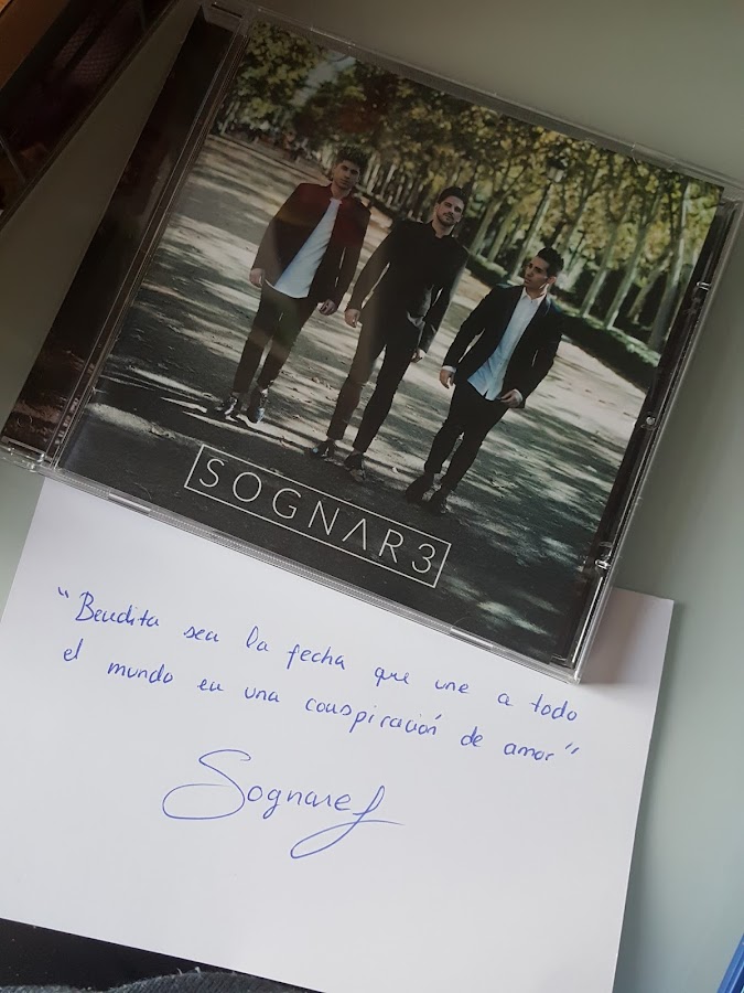 Cuando llegó el momento de la firma le entregamos además su detalle. Y ellos también tenían algo que darme. Porque yo he formado un poco parte de este proyecto ; me gustaba su música y en ese momento podía hacerlo, así que colaboré como mecenas en el micromecenazgo del disco, por lo que de manos de Iván recibí mi disco y una bonita tarjeta con una cita preciosa: "Bendita sea la fecha que une a todo el mundo en una conspiración de amor". La desventaja es que no tengo una dedicatoria personalizada al 100% en el disco como las que iban firmando al momento, pero me hizo mucha ilusión ver mi nombre en los créditos del mismo. Me habría gustado haber aportado algo más pero por lo menos les pude ayudar a alcanzar su objetivo.