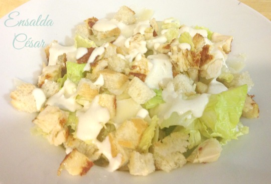 CONSEJO: Para que los picatostes no sean muy grasos, tuesta pan y córtalo en dados en vez de freírlos.Y finalmente, se pone por encima la salsa césar, y ¡a disfrutar!