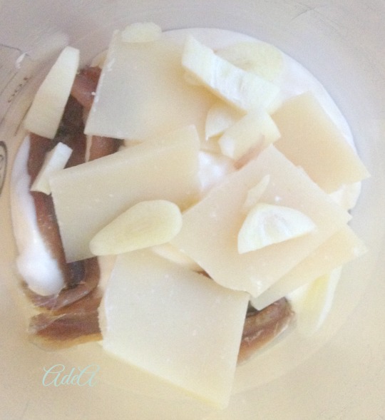 Para hacer la salsa, simplemente ponemos todos los ingredientes en la batidora y batimos hasta que quede una textura cremosa.