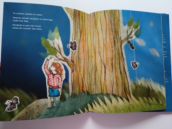 Y para hacer redondo este libro, un material visual impresionante. La artista coreana Soyeon Kim ha creado unas ilustraciones para este álbum, combinando en montajes fotográficos, material real, delicados dibujos y técnicas pictóricas para crear piezas tridimensionales (dioramas), que sirven de base para ilustrar el texto y lo complementan a la perfección. Como curiosidad: en las sobrecubiertas del álbum la artista nos cuenta como realizó los dioramas de "Eres polvo de estrellas". Sin duda, una minucioso y fantástico trabajo. ¡No tiene desperdicio! ¡Es una auténtica preciosidad! Por aquí seguimos con la boca abierta.