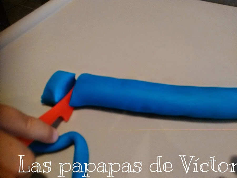 Hacemos un churro largo con otro trozo de pastelina azul y lo cortamos a trocitos