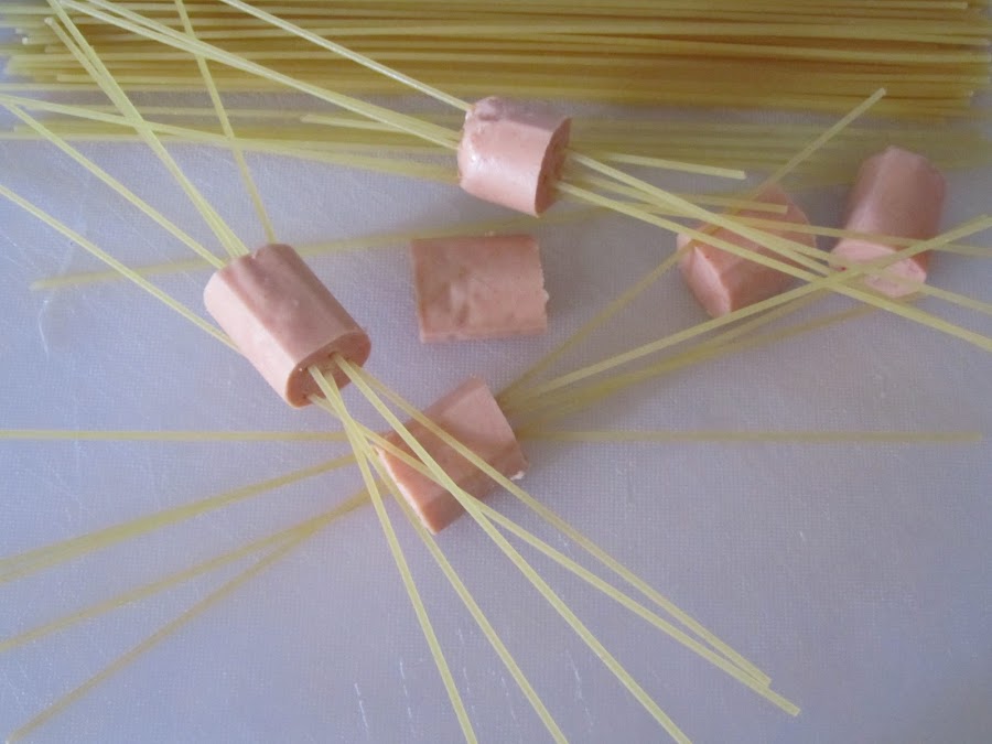 Sólo tenemos que introducir los espaguetis en crudo en trocitos de salchichas y hervirlos de la misma manera que lo hacemos siempre, en agua hirviendo los minutos indicados en el paquete de espaguetis.