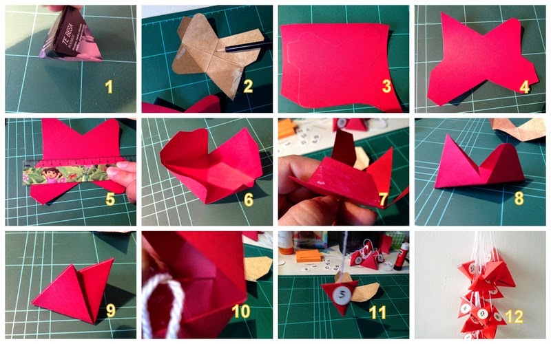 1- Me hice con una plantilla triangular, en mi caso es de una caja de tés que nos regalaron, me gusto mucho su forma y me guarde una cajita. Por supuesto en Internet podéis encontrar cientos de plantillas.