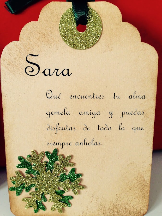 Descargué un tags de Internet, les puse el nombre y el texto que quería que llevara y las imprimí. Como este año invertí en un troquel con forma de copo de nieve, lo use para la decoración de la tarjeta, lo hice en dos colores y quedó así de chulo, después envejecí la tarjeta con una tinta distress e hice un agujero en la parte de arriba y le coloqué un lazo.