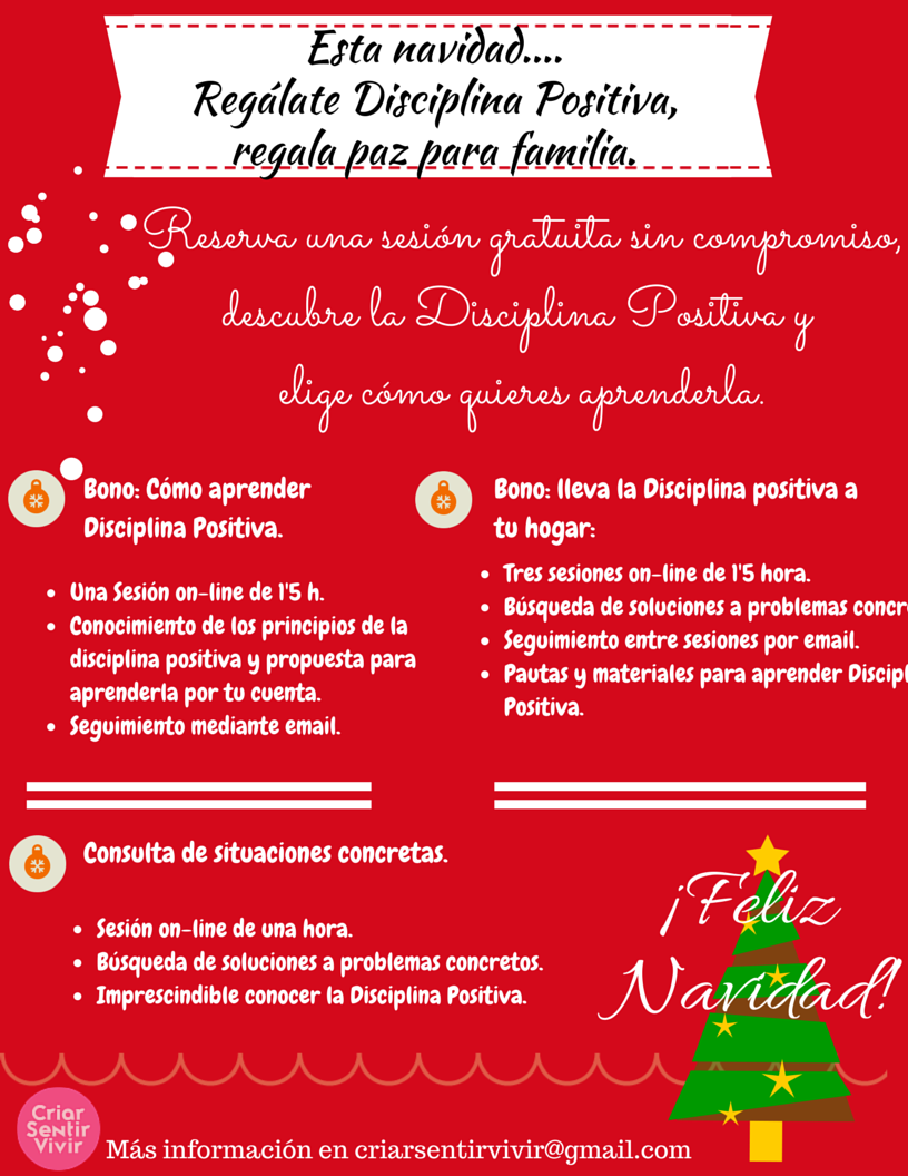 Quiero aprovechar las Navidades para proponerte que descubras la Disciplina Positiva. Desde que me certifiqué como educadora en Disciplina Positiva en octubre no he parado de difundir la disciplina positiva. En las redes sociales me he dedicado a lanzar mensajes sobre la disciplina positiva mediante fotografías o mi participación como administradora del grupo de facebook Sueño infantil y Disciplina Positiva (y en algunos otros..), en el blog, los artículos de la serie ¿Por qué los niños se portan mal? han sido el preludio a una nueva etapa como educadora, y por último, las sesiones de asesoramiento on-line para educar con disciplina positiva que tengo la suerte de realizar todas las semanas, han hecho que pudiera llegar a unos cuantos hogares más de una manera muy intensa.